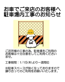 駐車場内工事の為、ご利用のお客様は十分注意をお願いいたします。